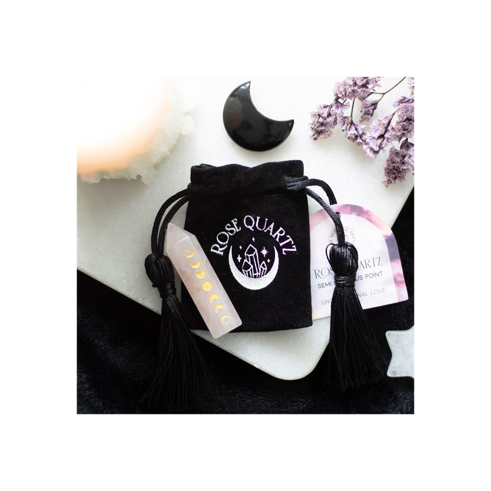 This beautiful rose quartz crystal point is perfect in size for travel altars, desk decor or taking on the go for extra protection. Features a gold-tone moon phase engraving and comes with a matching drawstring bag for storage and safe-keeping.  Product Dimensions: H5cm x W1.2cm x D1.1cm  Packaged Dimensions: H8cm x W5.5cm x D1.4cm