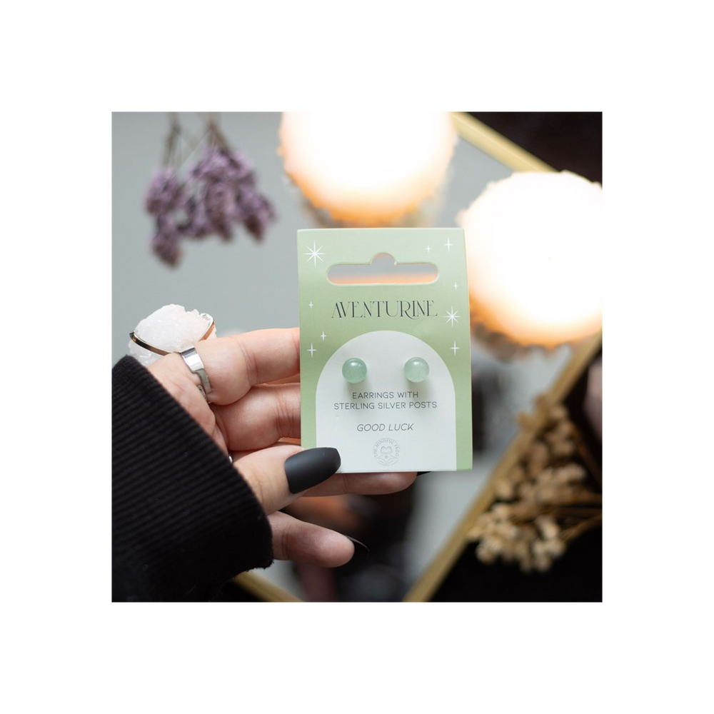 This pair of aventurine crystal stud earrings comes on a matching backing card and makes a meaningful gift for those in need of spiritual protection. Aventurine is a powerful semi-precious stone believed to attract prosperity and positive energy, making it an ideal token for good luck. Finished with sterling silver posts with butterfly backs.