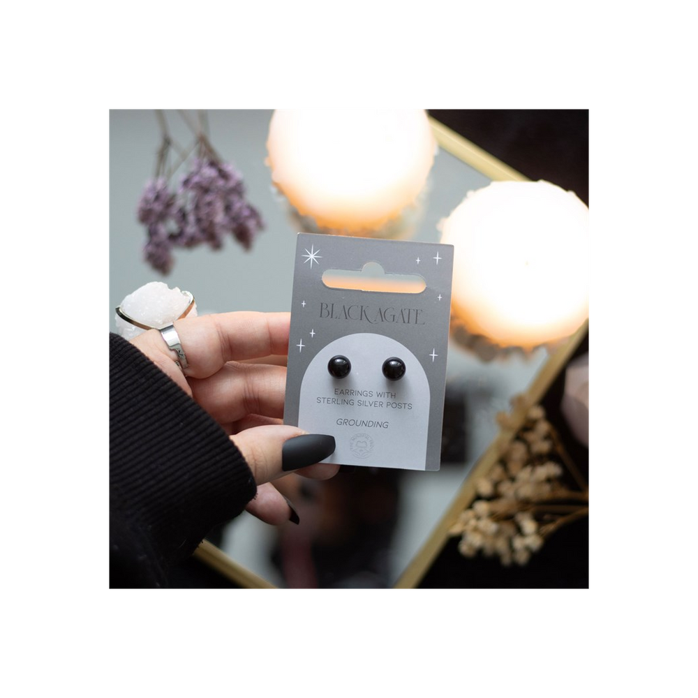 This pair of black agate crystal stud earrings comes on a matching backing card and makes a meaningful gift for those in need of spiritual protection. Black agate is a powerful semi-precious stone believed to create harmony and calm dark forces, making it ideal for grounding on protection. Finished with sterling silver posts with butterfly backs.