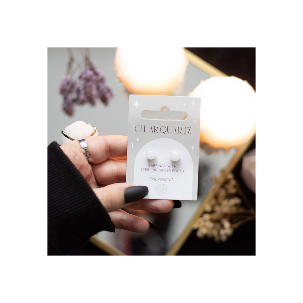 This pair of clear quartz crystal stud earrings comes on a matching backing card and makes a meaningful gift for those in need of spiritual protection. Clear quartz is a powerful semi-precious stone believed to amplify energy and promote clarity of mind, making it ideal for power and vitality. Finished with sterling silver posts with butterfly backs.