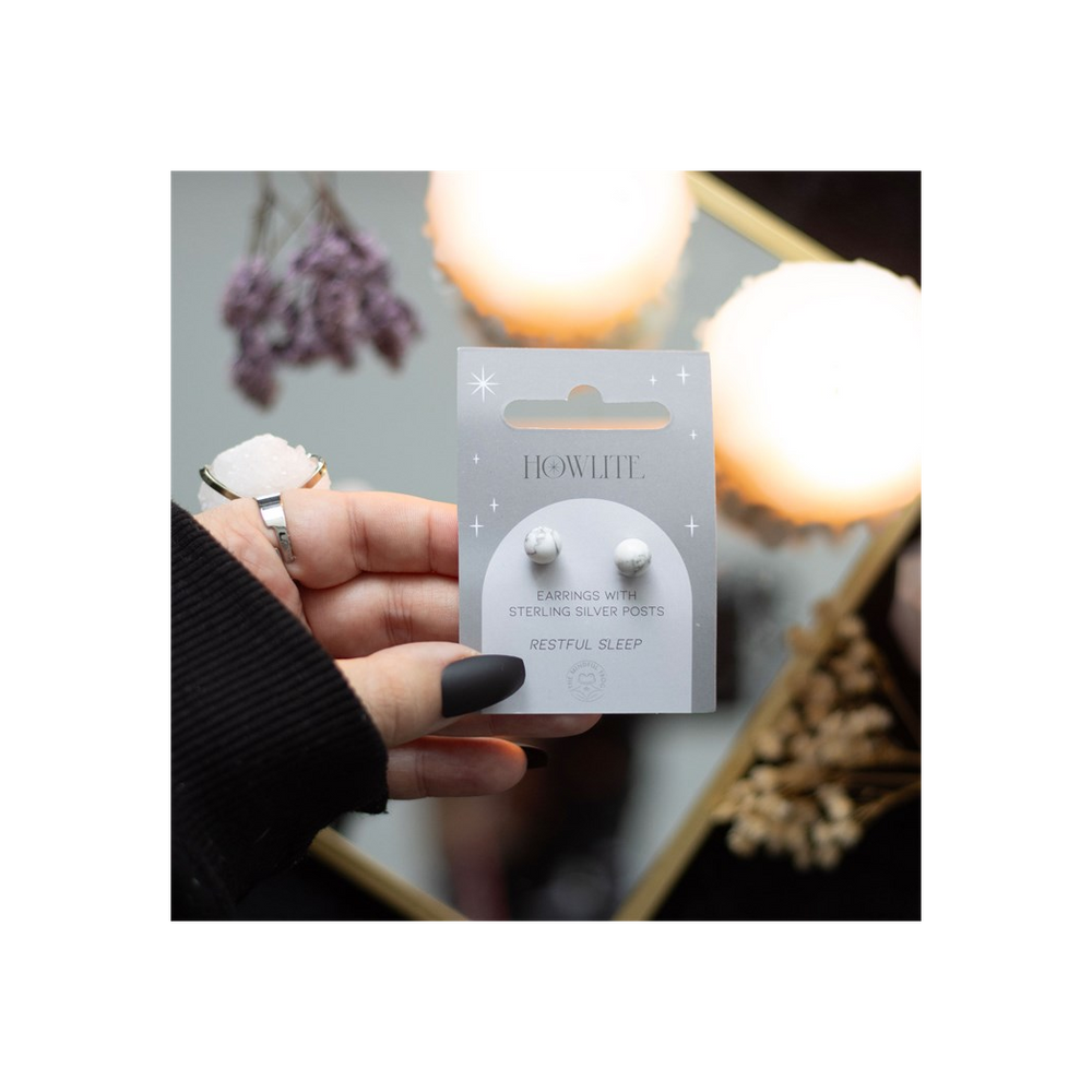 This pair of howlite crystal stud earrings comes on a matching backing card and makes a meaningful gift for those in need of spiritual protection. Howlite is a powerful semi-precious stone believed to absorb stress and negative thoughts, making it ideal for emotional healing and relaxation. Finished with sterling silver posts with butterfly backs.