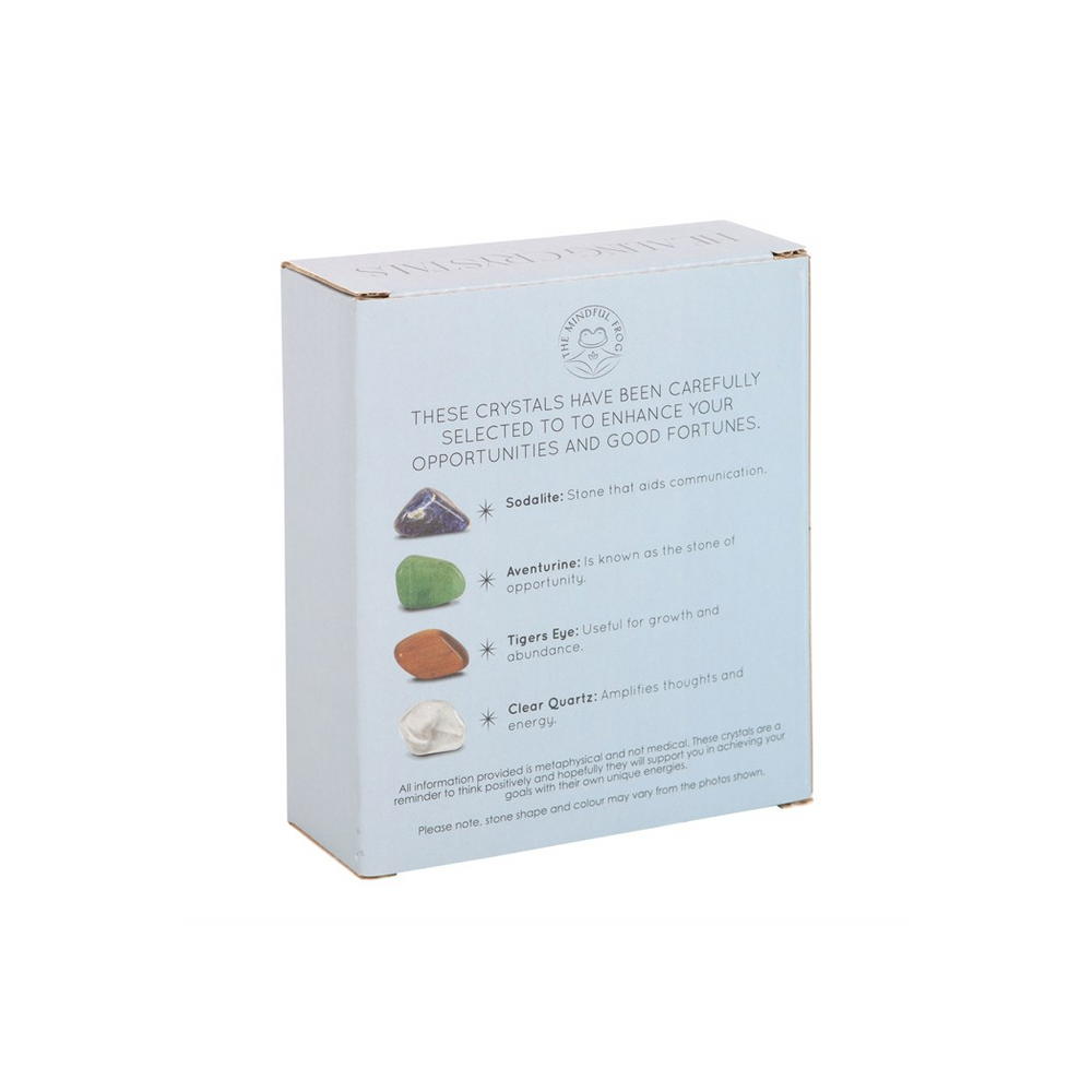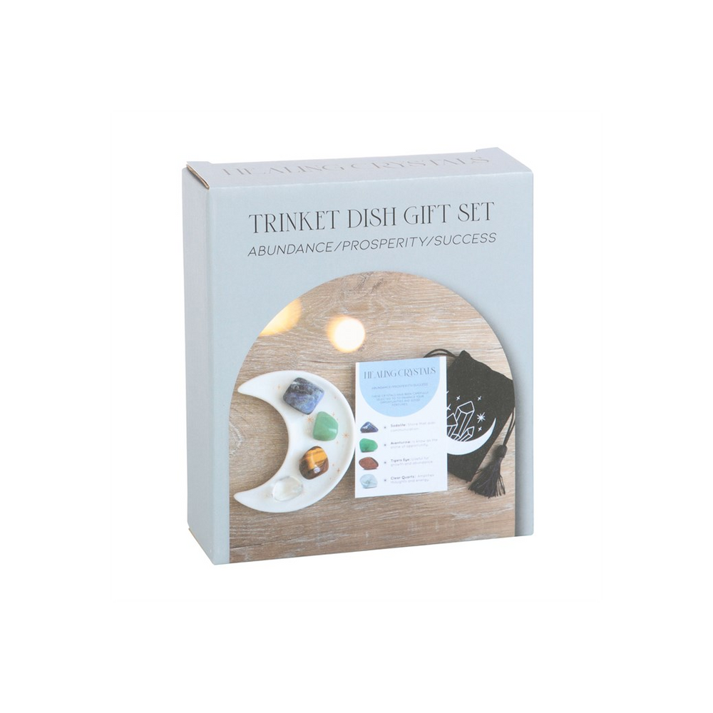 This stunning set of healing crystals comes with four crystal tumblestones to help attract prosperity and success. Includes a crescent moon trinket dish, matching information card and a printed drawstring, making this a meaningful gift for those in need of some extra care. Stones include; sodalite, aventurine, tiger's eye and clear quartz.  Product Dimensions: H1.5cm x W10.5cm x D12.3cm  Packaged Dimensions: H13cm x W11cm x D4cm